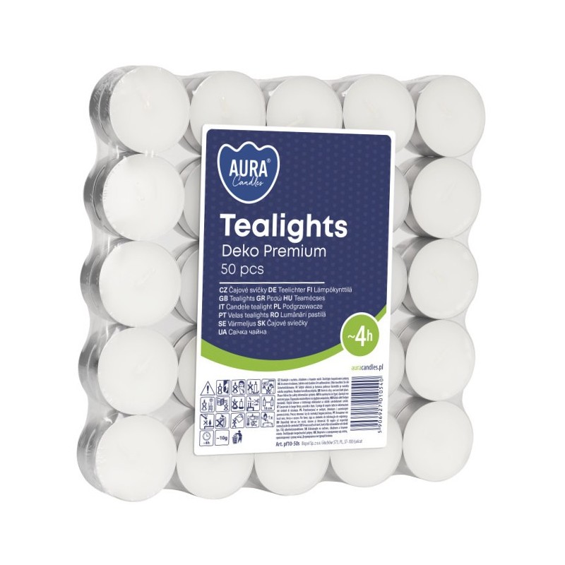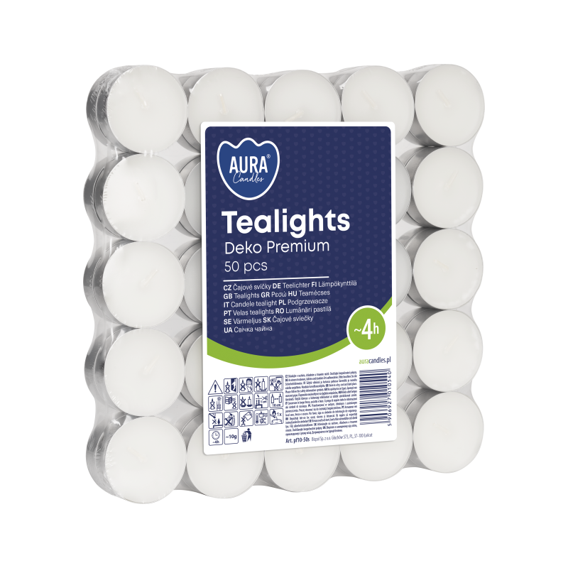 Tealighty Podgrzewacze bezzapachowe o czasie palenia do 4 godzin BISPOL. Pakowane po 50 szt jednostkowych w opakowaniu zbiorczym.