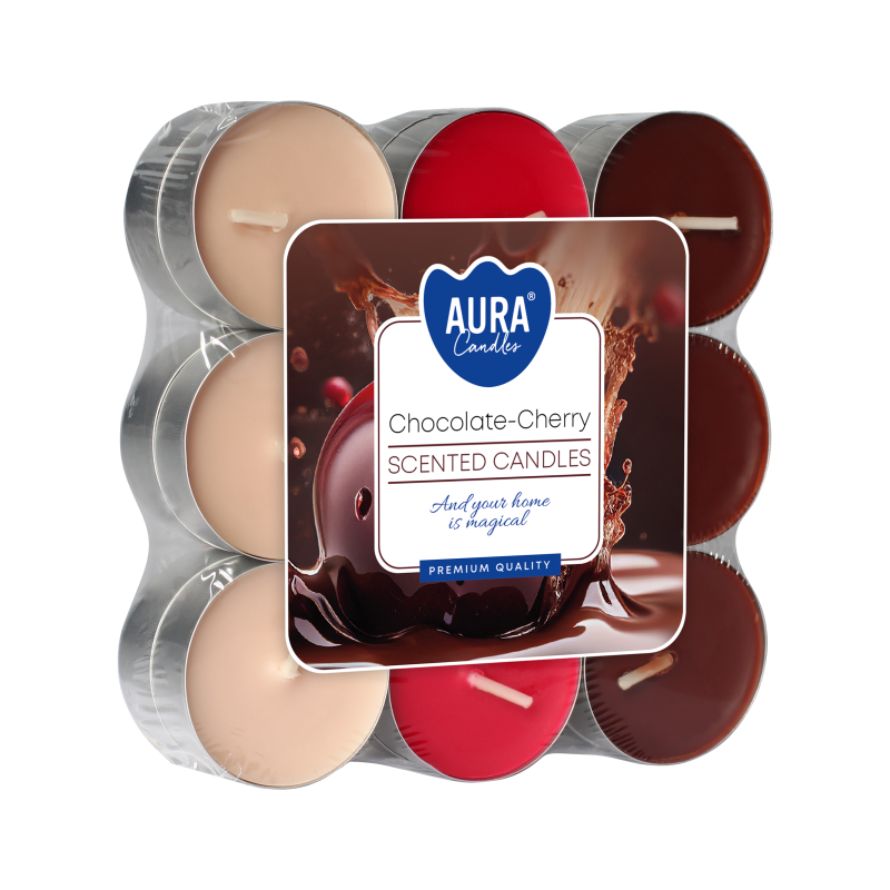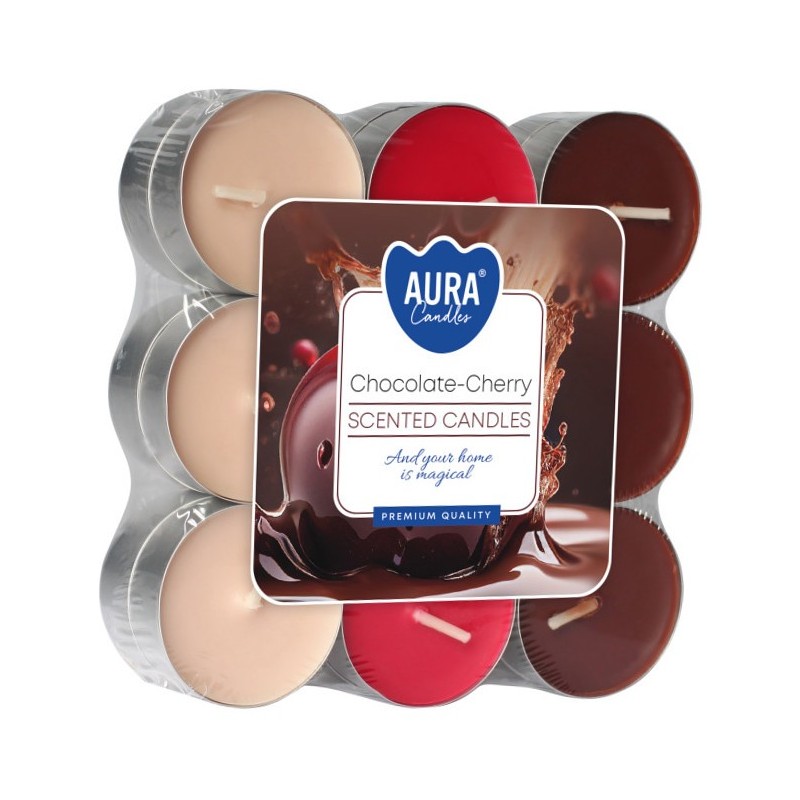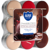 Tealighty Podgrzewacze o zapachu czekolady i wiśni, różnobarwnym wosku i czasie palenia do 4 godzin BISPOL. Pakowane po 18 szt jednostkowych w opakowaniu zbiorczym.