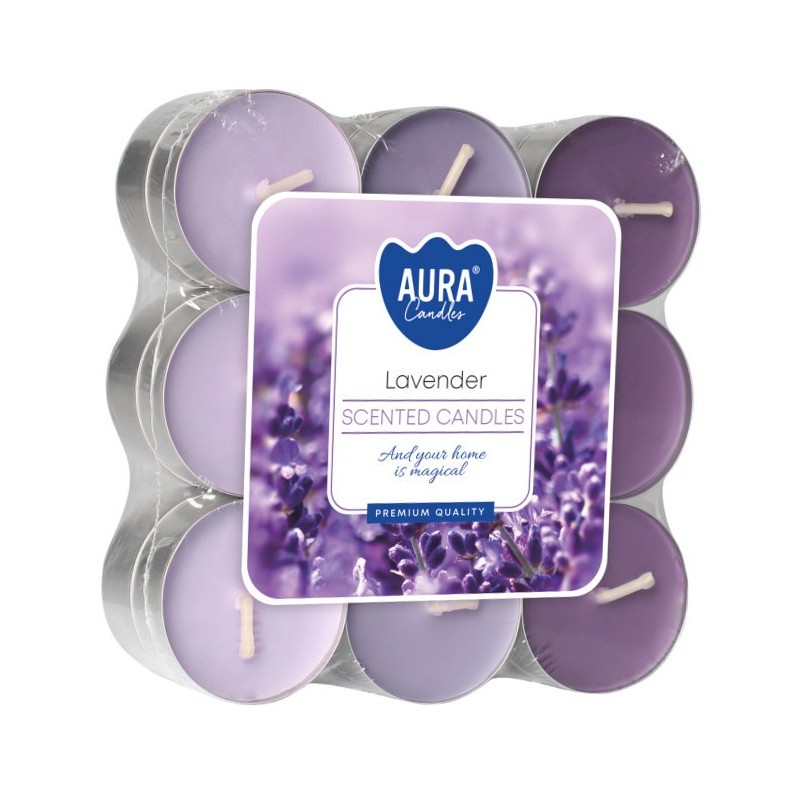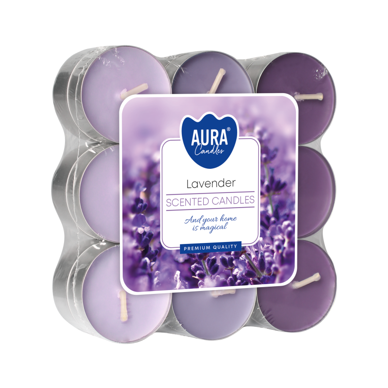 Tealighty Podgrzewacze o zapachu lawendy, różnobarwnym wosku i czasie palenia do 4 godzin BISPOL. Pakowane po 18 szt jednostkowych w opakowaniu zbiorczym.