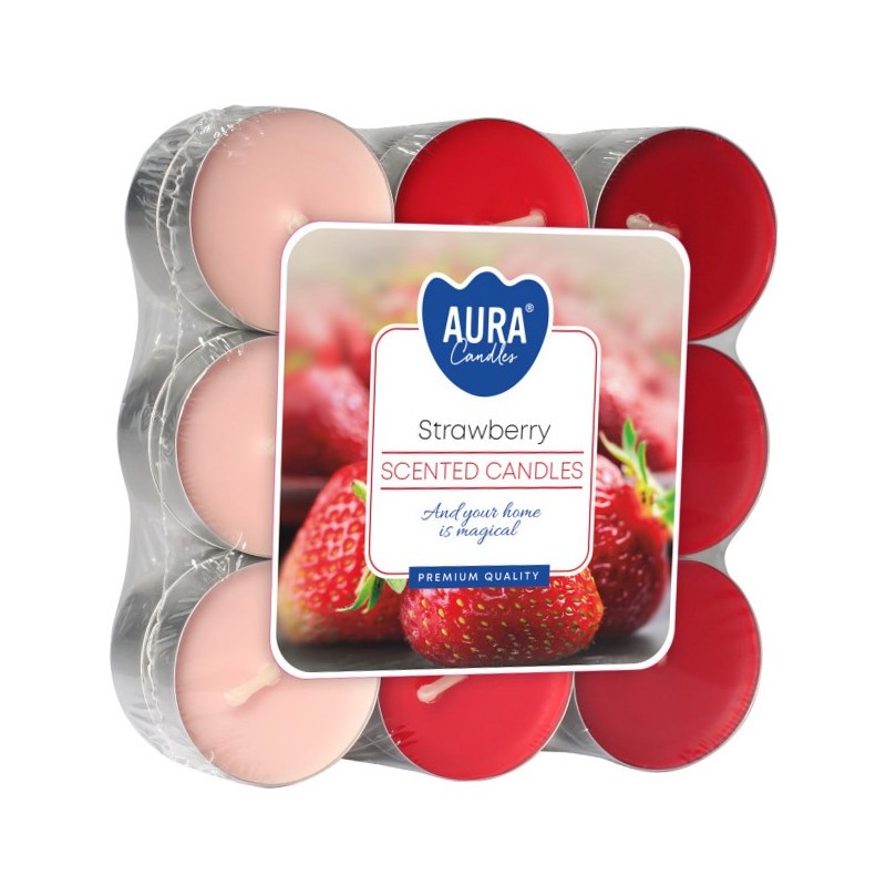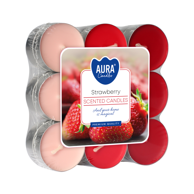 Tealighty Podgrzewacze o zapachu truskawki, różnobarwnym wosku i czasie palenia do 4 godzin BISPOL. Pakowane po 18 szt jednostkowych w opakowaniu zbiorczym.