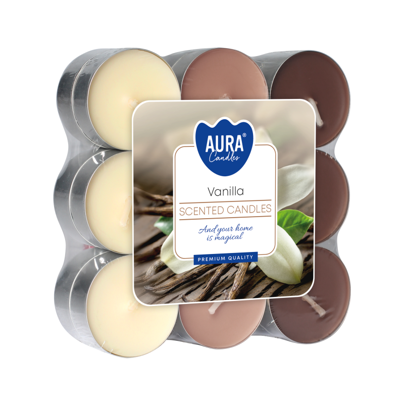 Tealighty Podgrzewacze o zapachu wanilii, różnobarwnym wosku i czasie palenia do 4 godzin BISPOL. Pakowane po 18 szt jednostkowych w opakowaniu zbiorczym.Aromatyczny zapach wydzielany podczas spalania oraz długi czas palenia tworzą niezapomniany klimat dzięki czemu sprawiają, że podgrzewacze zapachowe idealnie sprawdzą się jako element dekoracyjny domu, hotelu, biura, sali bankietowej, salonu masażu, gabinetu kosmetycznego lub innej przestrzeni publicznej.