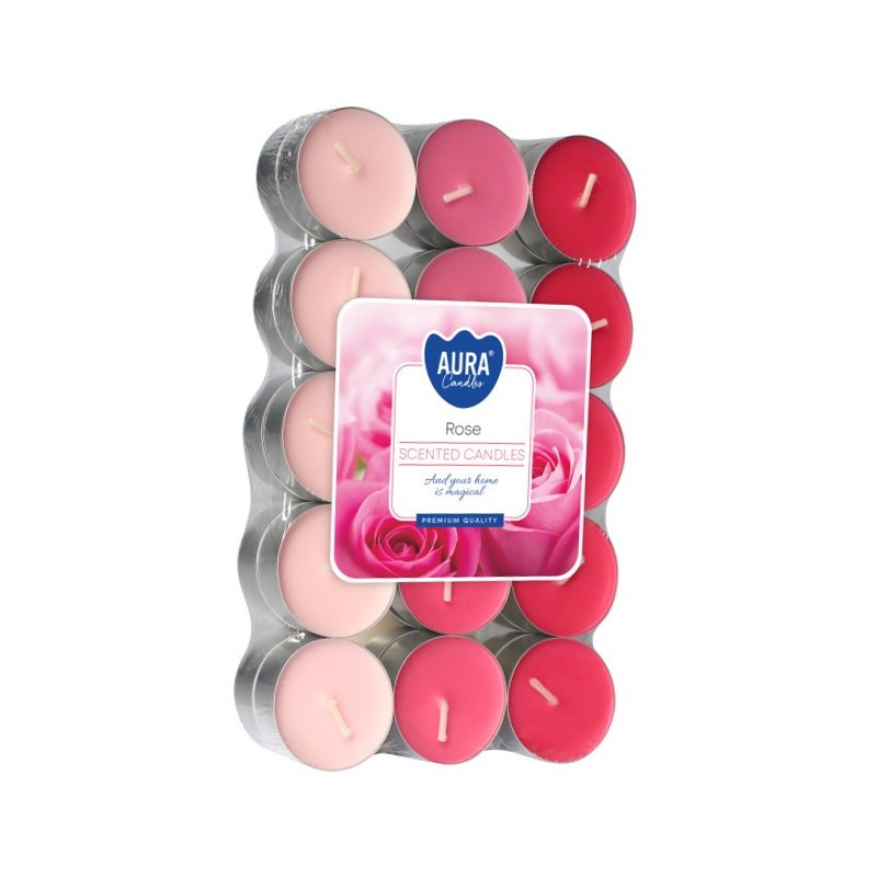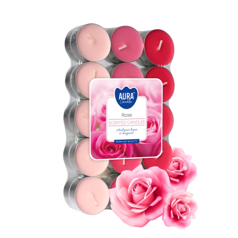 Tealighty Podgrzewacze o zapachu róża, różnobarwnym wosku i czasie palenia do 4 godzin BISPOL. Pakowane po 30 szt jednostkowych w opakowaniu zbiorczym.