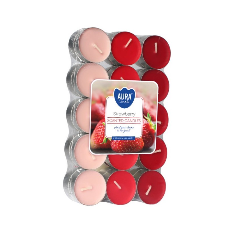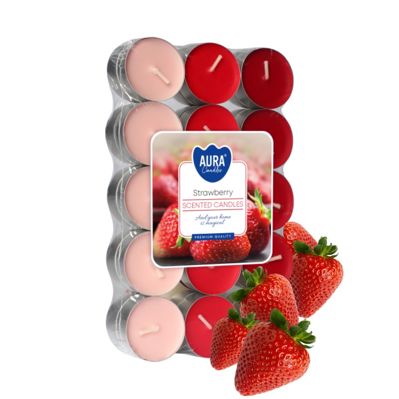 Tealighty Podgrzewacze o zapachu truskawki, różnobarwnym wosku i czasie palenia do 4 godzin BISPOL. Pakowane po 30 szt jednostkowych w opakowaniu zbiorczym.
