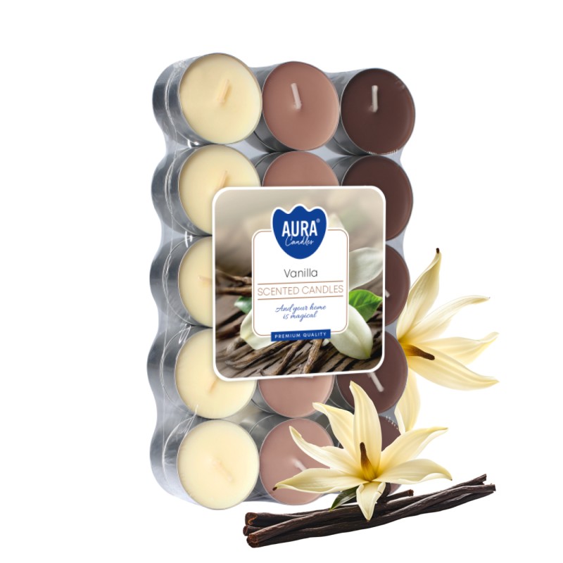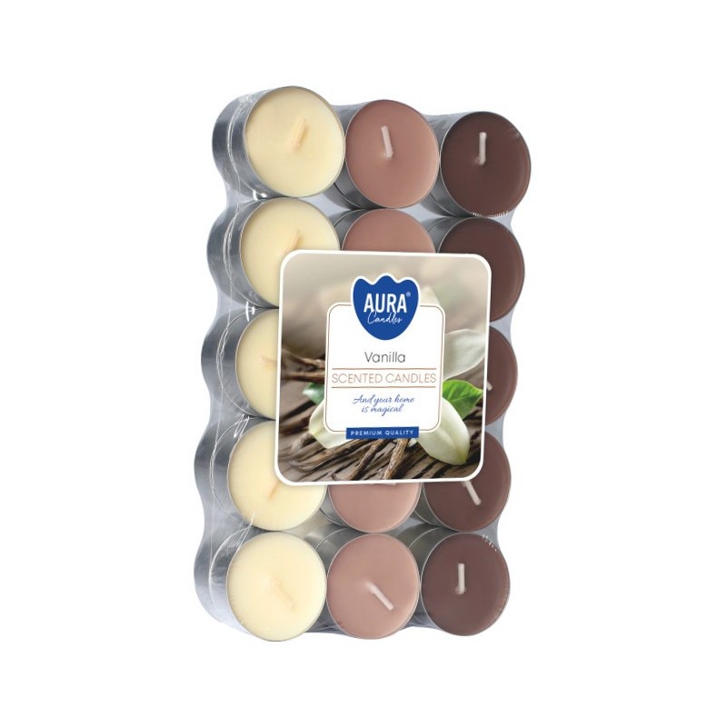 Tealighty Podgrzewacze o zapachu wanilii, różnobarwnym wosku i czasie palenia do 4 godzin BISPOL. Pakowane po 30 szt jednostkowych w opakowaniu zbiorczym.