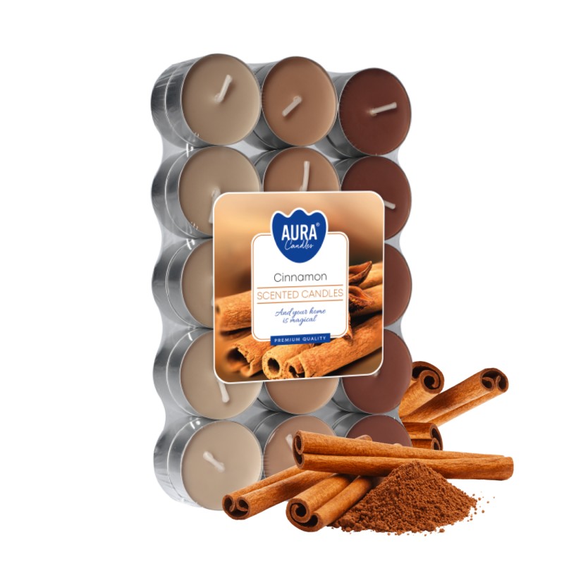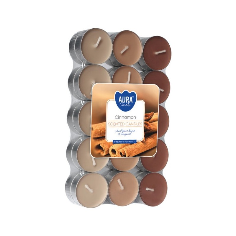Tealighty Podgrzewacze o zapachu cynamonu, różnobarwnym wosku i czasie palenia do 4 godzin BISPOL. Pakowane po 30 szt jednostkowych w opakowaniu zbiorczym.