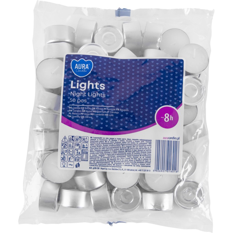 Podgrzewacze bezzapachowe tealight BISPOL Aura 8H NIGHT LIGHTS 50szt.