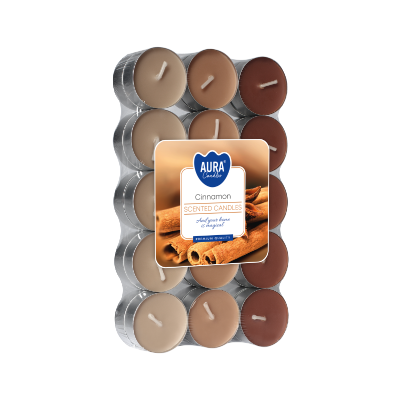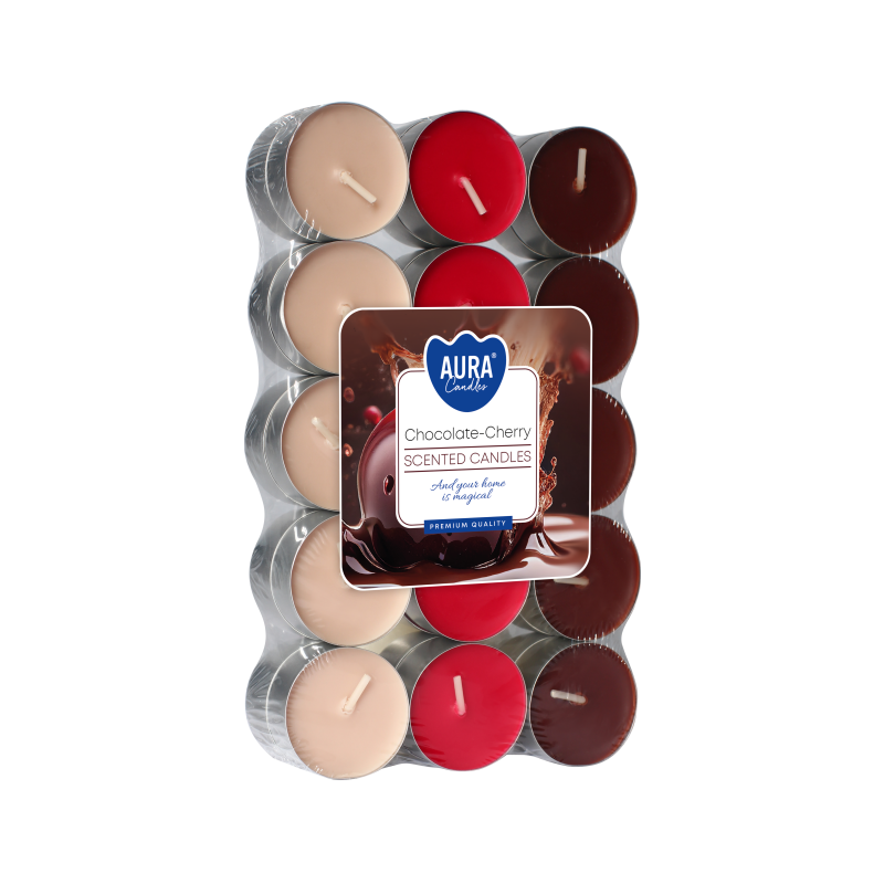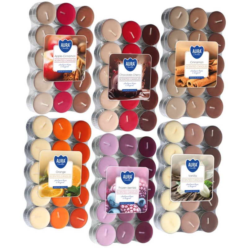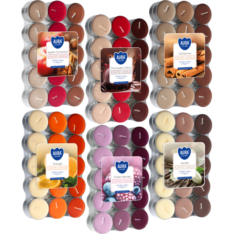 ZESTAW Tealighty Podgrzewacze w mixie 6-ciu zapachów, różnobarwnym wosku i czasie palenia do 4 godzin BISPOL. Pakowane po 6x30 szt jednostkowych w opakowaniu zbiorczym.