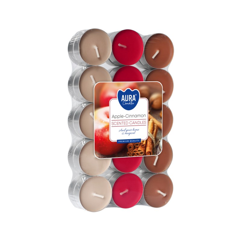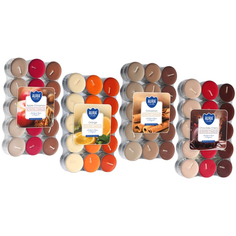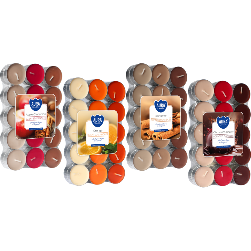 ZESTAW Tealighty Podgrzewacze w mixie 4-ech zapachów, różnobarwnym wosku i czasie palenia do 4 godzin BISPOL. Pakowane po 4x30 szt jednostkowych w opakowaniu zbiorczym.