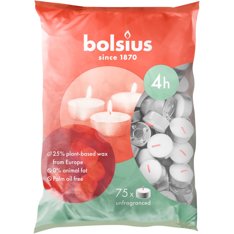 Tealighty Podgrzewacze bezzapachowe o czasie palenia do 4 godzin BOLSIUS. Pakowane po 75 szt jednostkowych w opakowaniu zbiorczym.