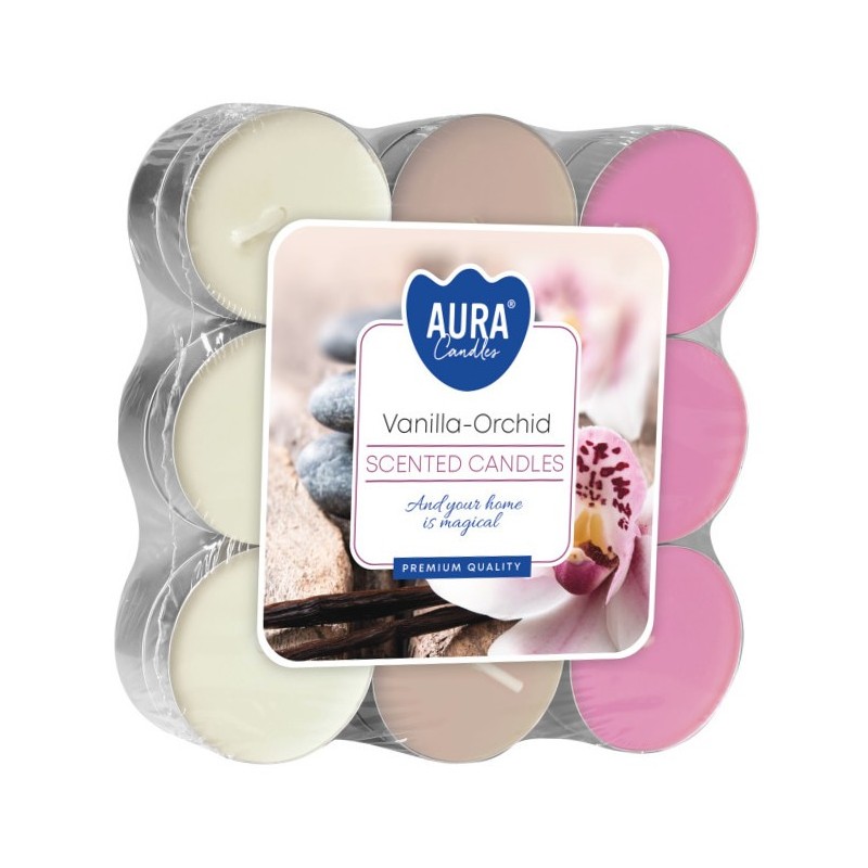 Tealighty Podgrzewacze o zapachu wanilii i orchidei, różnobarwnym wosku i czasie palenia do 4 godzin BISPOL. Pakowane po 18 szt jednostkowych w opakowaniu zbiorczym.