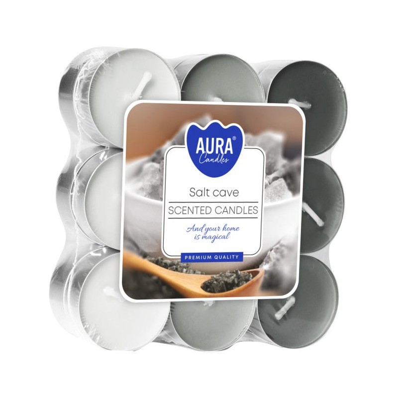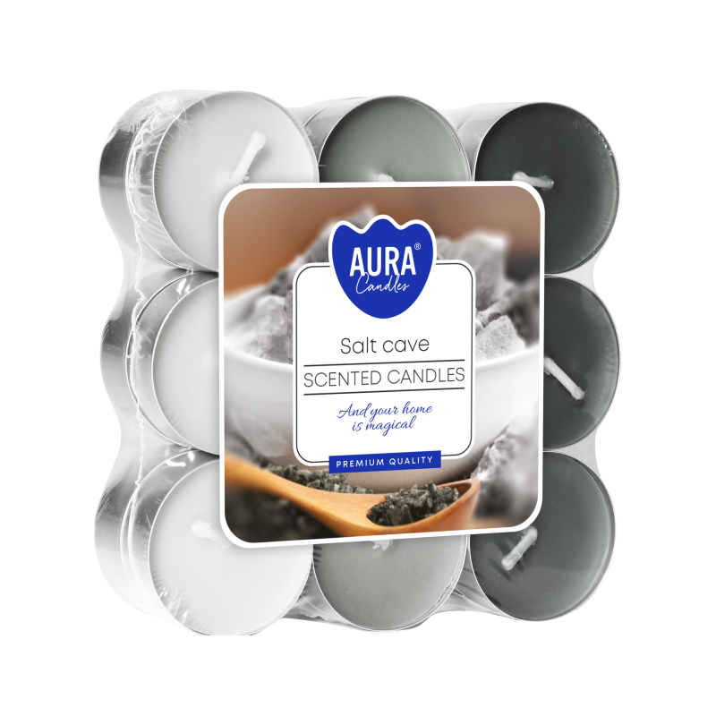 Tealighty Podgrzewacze o zapachu groty solnej, różnobarwnym wosku i czasie palenia do 4 godzin BISPOL. Pakowane po 18 szt jednostkowych w opakowaniu zbiorczym.