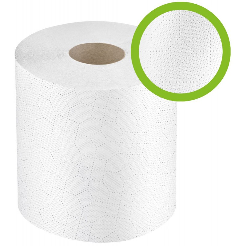 Dwuwarstwowy, ręcznik papierowy celulozowy na roli o wysokości 19cm w kolorze białym.