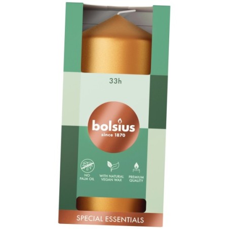 Dekoracyjna świeca pieńkowa z serii Special essentials w kształcie walca, kolorze metaliczny złoty, bezzapachowa o wysokości 12cm, średnicy 5,8cm i czasie palenia do 33 godzin BOLSIUS.
