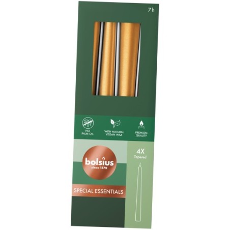 Dekoracyjna świeca stołowa z serii Special essentials w kolorze metaliczny złoty, kształcie stożka, bezzapachowa o wysokości 24,5cm, średnicy 2,4cm i czasie palenia do 7 godzin BOLSIUS.