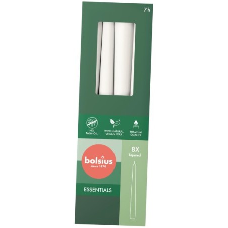 Dekoracyjna świeca stołowa z serii essentials w kolorze mroźna biel, kształcie stożka, bezzapachowa o wysokości 24,5cm, średnicy 2,4cm i czasie palenia do 7 godzin BOLSIUS.