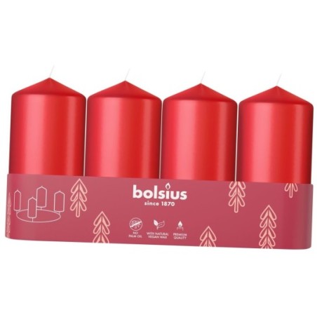 Dekoracyjna świeca pieńkowa z serii essentials w kształcie walca, kolorze Delikatna Czerwień, bezzapachowa o wysokości 10cm, średnicy 44mm i czasie palenia do 19 godzin BOLSIUS.