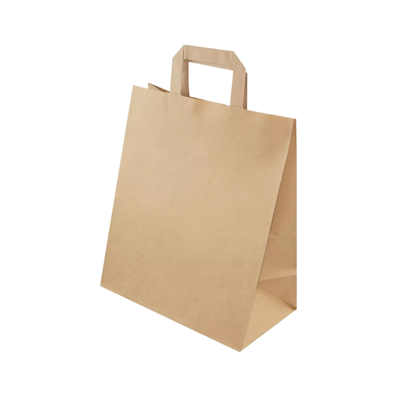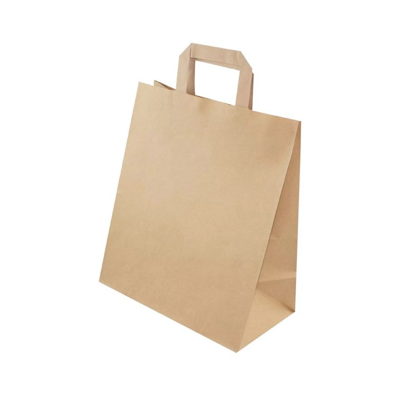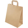 Torba papierowa z uchwytem płaskim (klejonym) o wymiarze 26x14x30cm i gramaturze 70gsm, w kolorze brązowym (kraft).