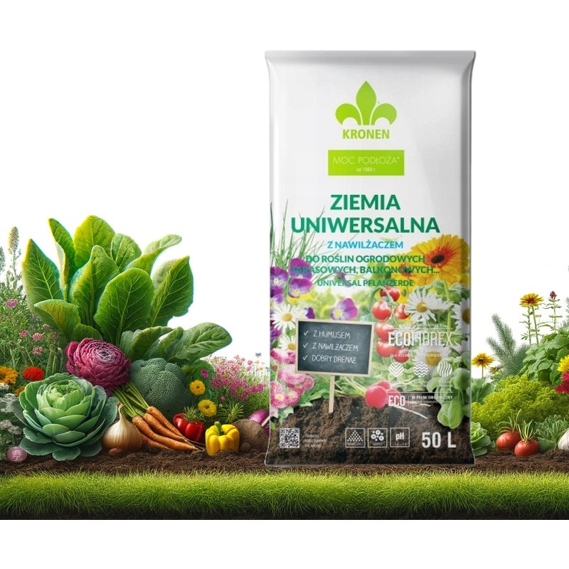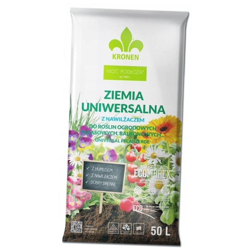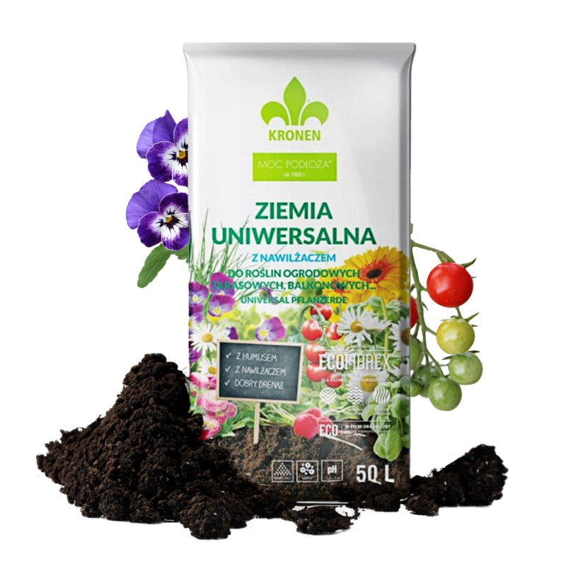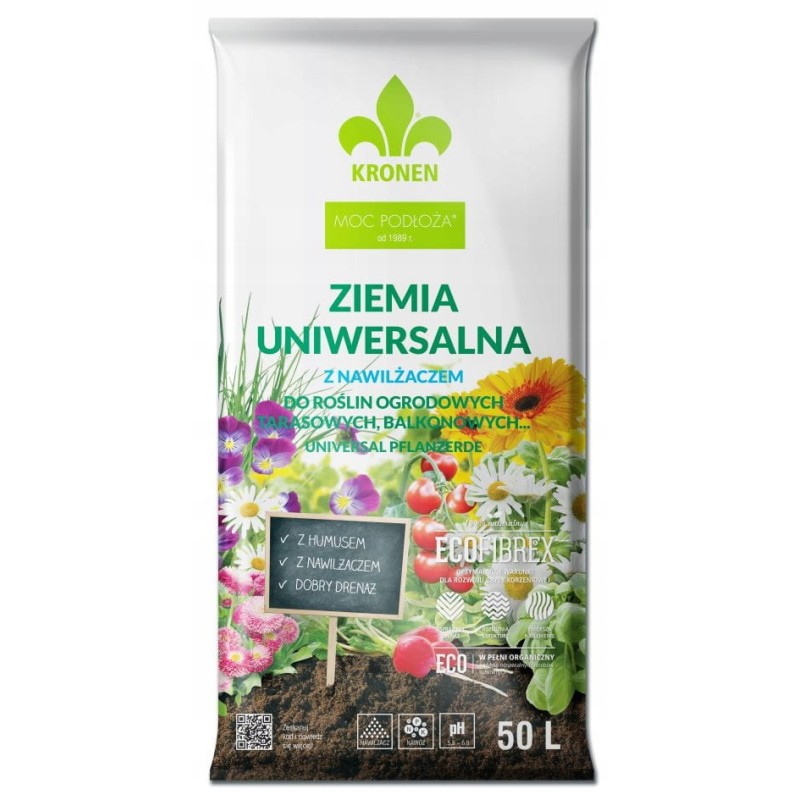 KRONEN® ziemia uniwersalna to wysokowartościowe, gotowe do użycia naturalne podłoże wyprodukowane na bazie torfu wysokiego o różnym stopniu rozkladu z dodatkiem włókien drzewnych ECOFIBREX®. Odpowiednie zestawienie tych dwóch komponentów pozwolilo na uzyskanie podłoża o lekkiej przewiewnej strukturze i dobrym drenażu. Struktura podłoża zapewnia równomierny, zdrowy rozrost bryty korzeniowej. Ziemia uniwersalna zawiera nawilżacz i nawóz z mikroelementami.