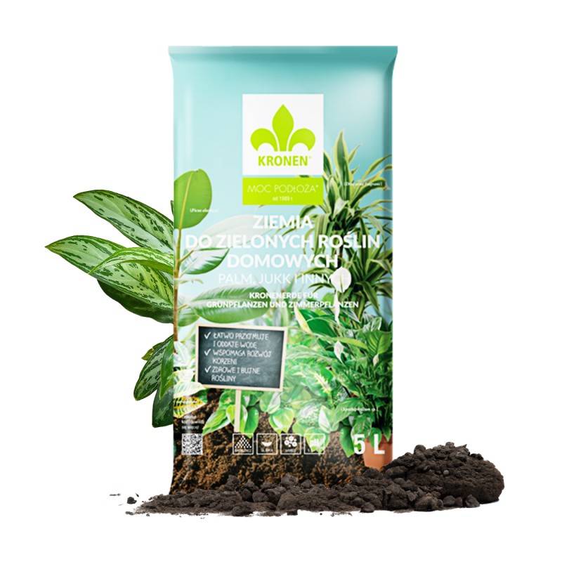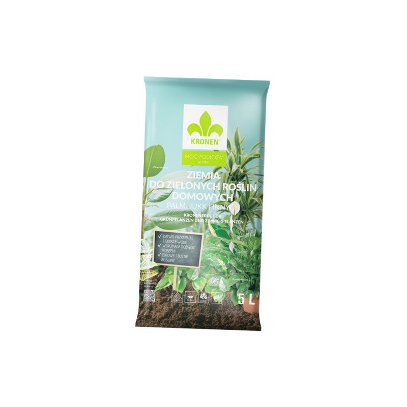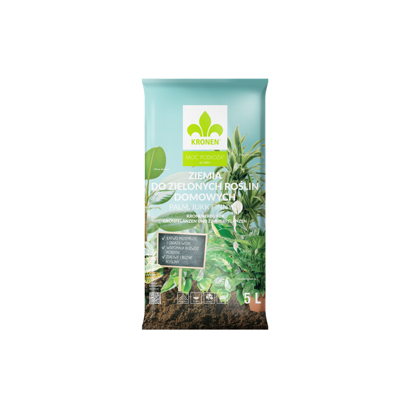 KRONEN® Ziemia do zielonych roślin domowych to gotowe do użycia podłoże przeznaczone do sadzenia i przesadzania roślin zielonych, takich jak palmy, juki czy draceny, uprawianych w warunkach domowych. Produkt dostępny jest w opakowaniach o pojemności 5 i 10 litrów.