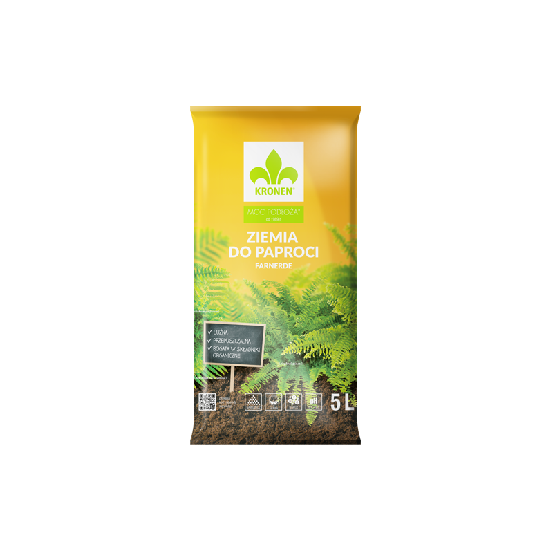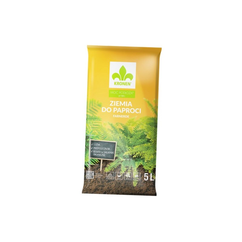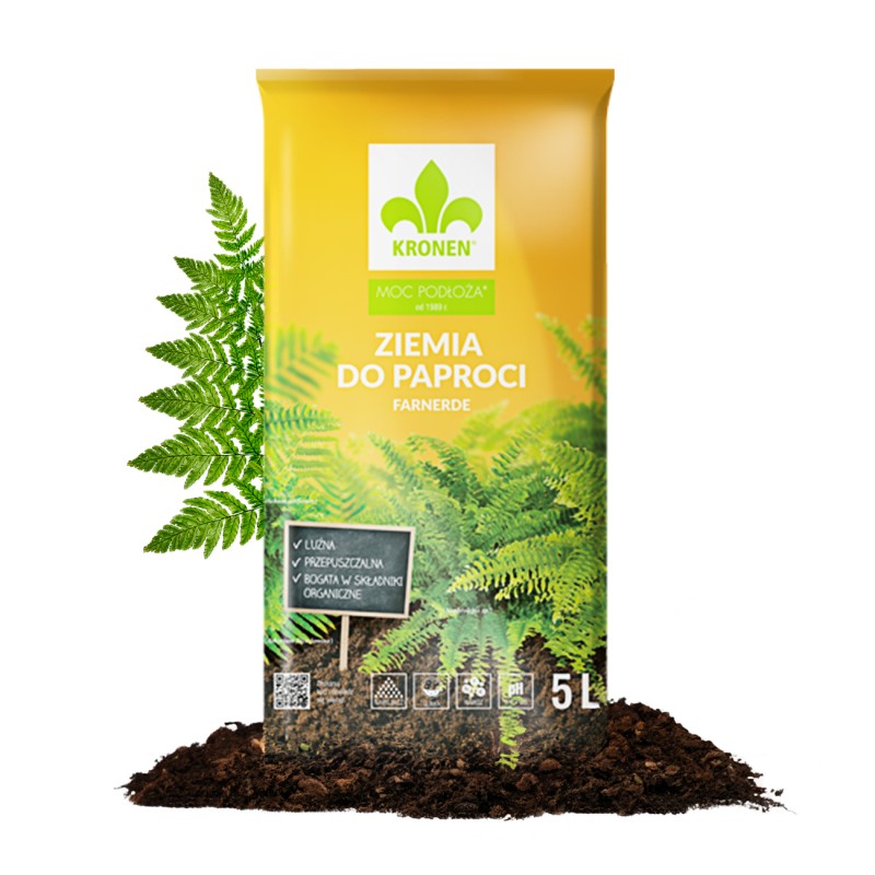KRONEN® Ziemia do paproci to gotowe do użycia podłoże, specjalnie opracowane dla potrzeb paproci oraz innych roślin wymagających luźnego, przepuszczalnego i bogatego w składniki odżywcze środowiska. Produkt dostępny jest w opakowaniach o pojemności 5 litrów.
