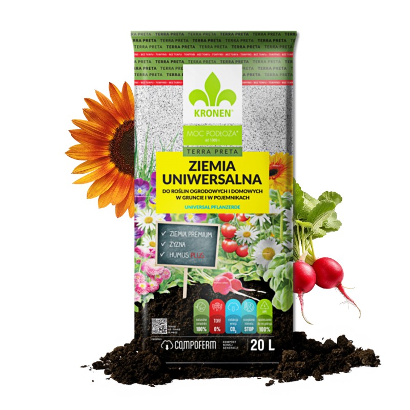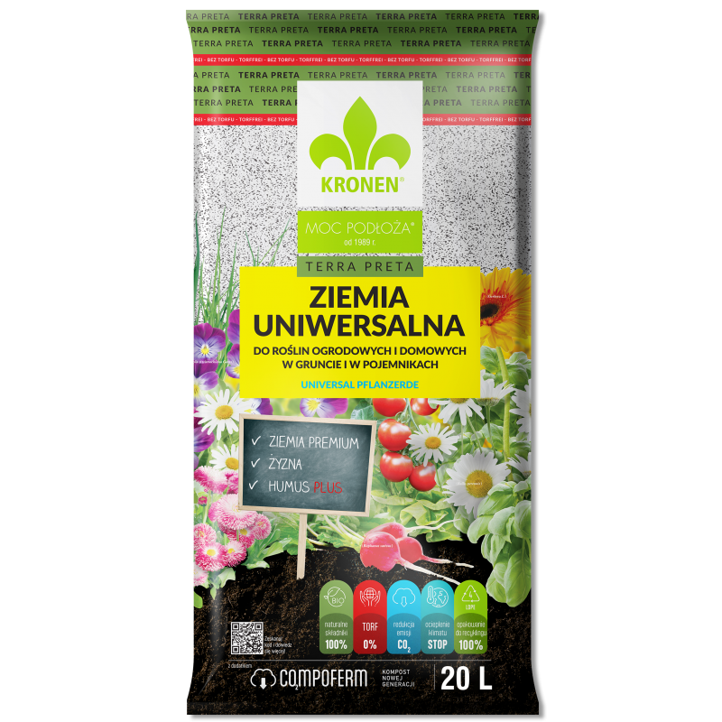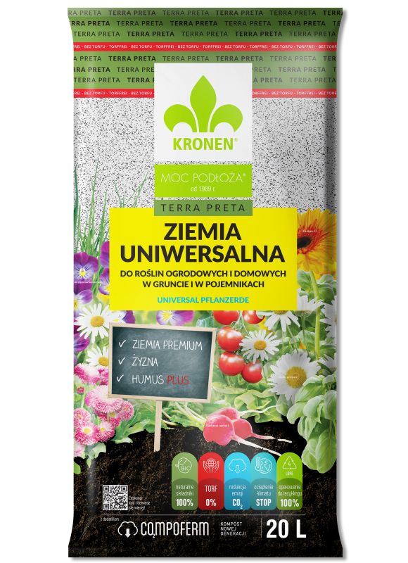 KRONEN® TERRA PRETA Ziemia uniwersalna to gotowe do użycia, beztorfowe podłoże przeznaczone do sadzenia i przesadzania różnorodnych roślin ozdobnych zielonych i kwitnących, warzyw, ziół, bylin oraz iglaków w pojemnikach na balkonach, tarasach i w ogrodach. Nie jest zalecane dla roślin kwaśnolubnych.