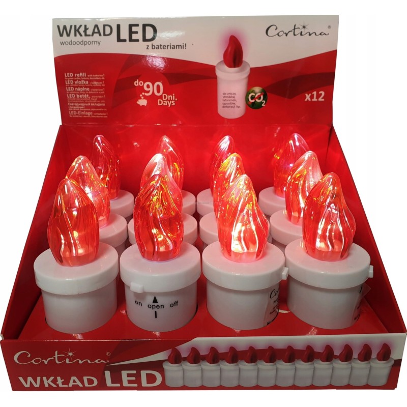 Znicz LED CORTINA w kolorze czerwonym, wodoodporny, o wysokości 10,7cm i czasie palenia do 90 dni. Znicz najwyższej jakości, nie wydziela CO2.