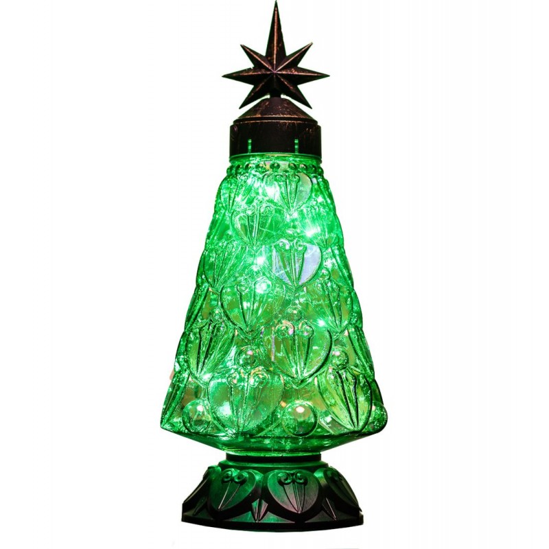 Znicz szklany z lampkami LED RGB SUBITO w kształcie choinki, kolorze zielonym oraz wysokości 46cm . Znicz najwyższej jakości, nie wydziela CO2.