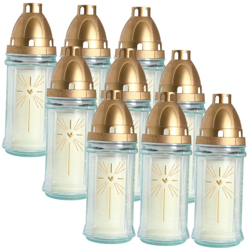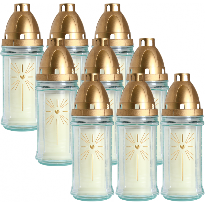 Znicze szklane w kolorze bezbarwnym. Zawierają zalewane wkłady parafinowe o czasie palenia do 42 godzin.
