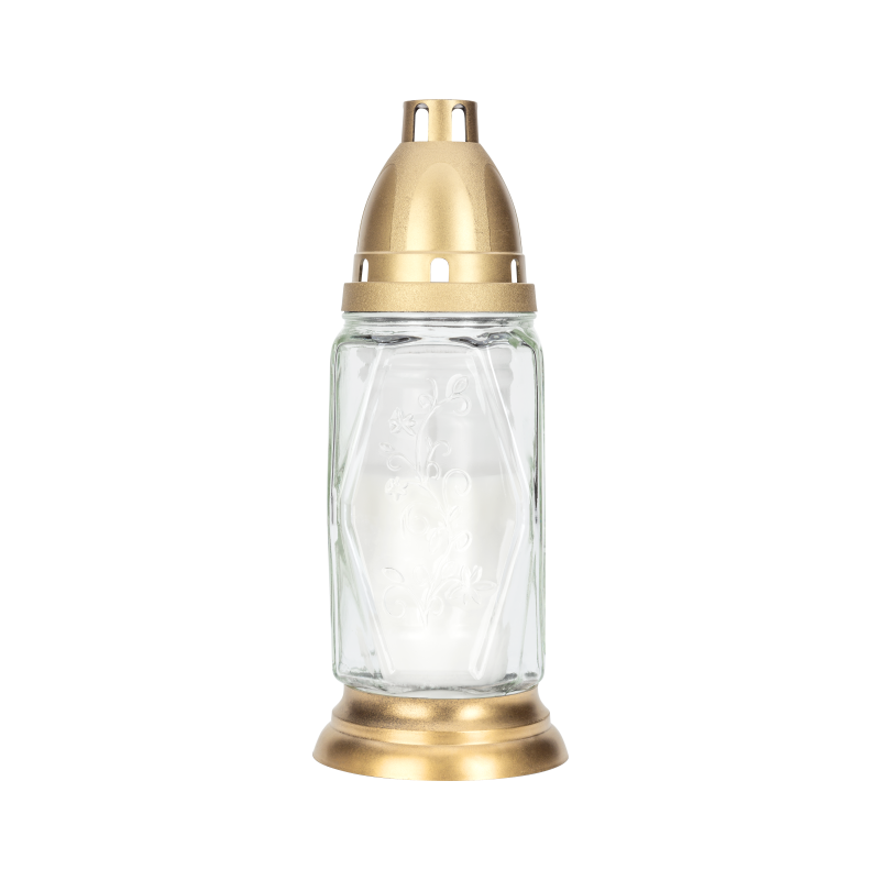Znicze szklane w kolorze złotym BISPOL. Zawierają zalewane wkłady parafinowe o czasie palenia do 25 godzin. Znicze najwyższej jakości. Wkłady nie kopcą i wypalają się równomiernie do końca.