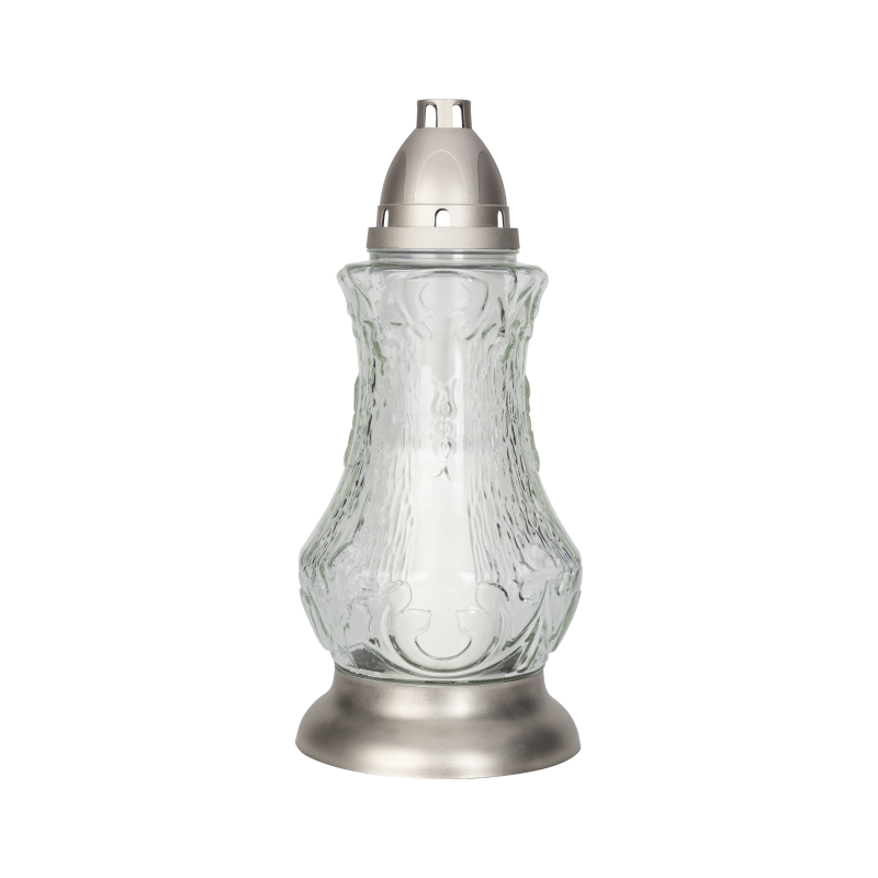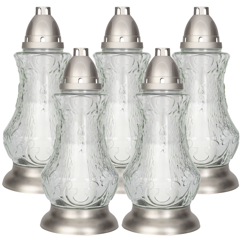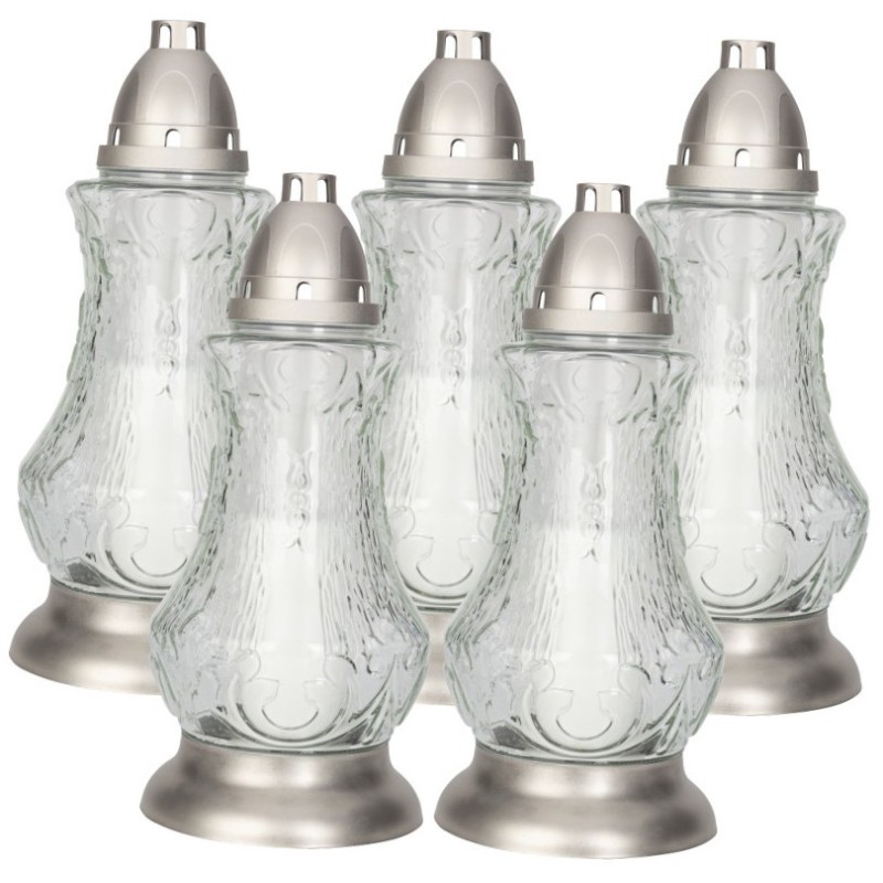 Znicze szklane w kolorze srebrnym BISPOL. Zawierają wprasowane wkłady parafinowe o czasie palenia do 66 godzin. Znicze najwyższej jakości. Wkłady nie kopcą i wypalają się równomiernie do końca.