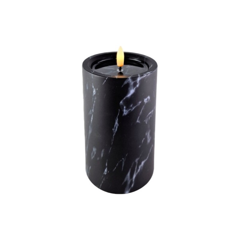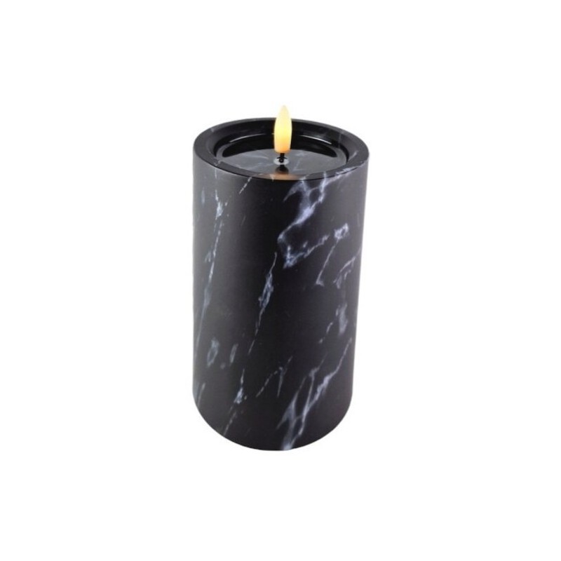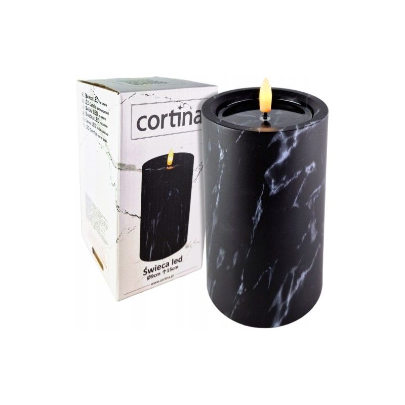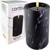 Świeca LED CORTINA w kolorze czarnym o wysokości 15cm, średnicy 9cm z imitacją efektu marmuru. Świeca najwyższej jakości, nie wydziela CO2.
