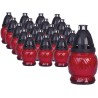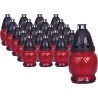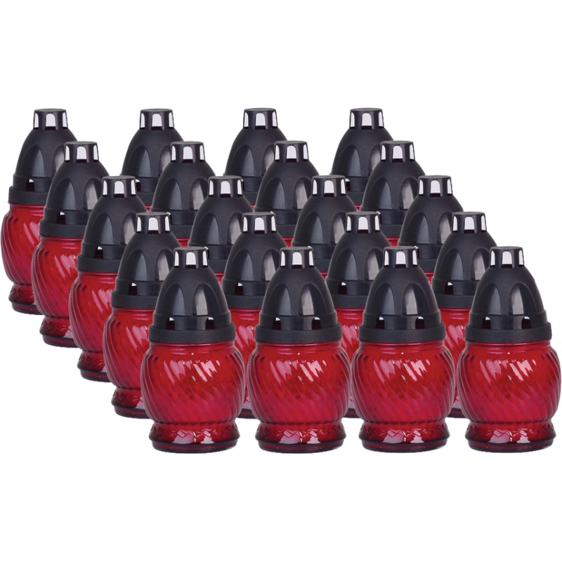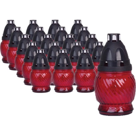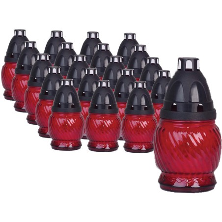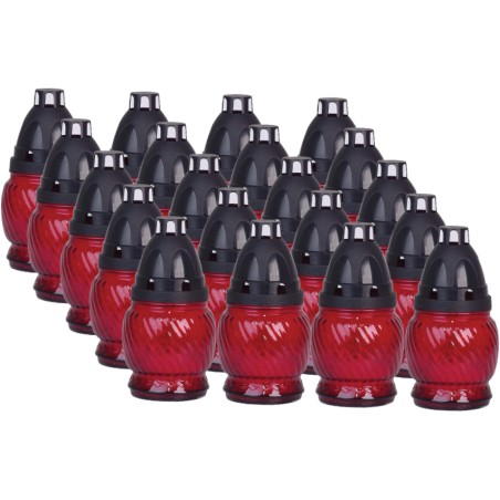 Znicze szklane w kolorze czerwonym. Zawierają wprasowane wkłady parafinowe o czasie palenia do 8 godzin. Znicze najwyższej jakości. Wkłady nie kopcą i wypalają się równomiernie do końca.