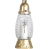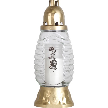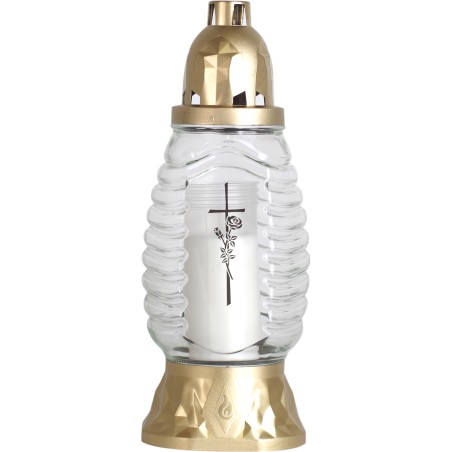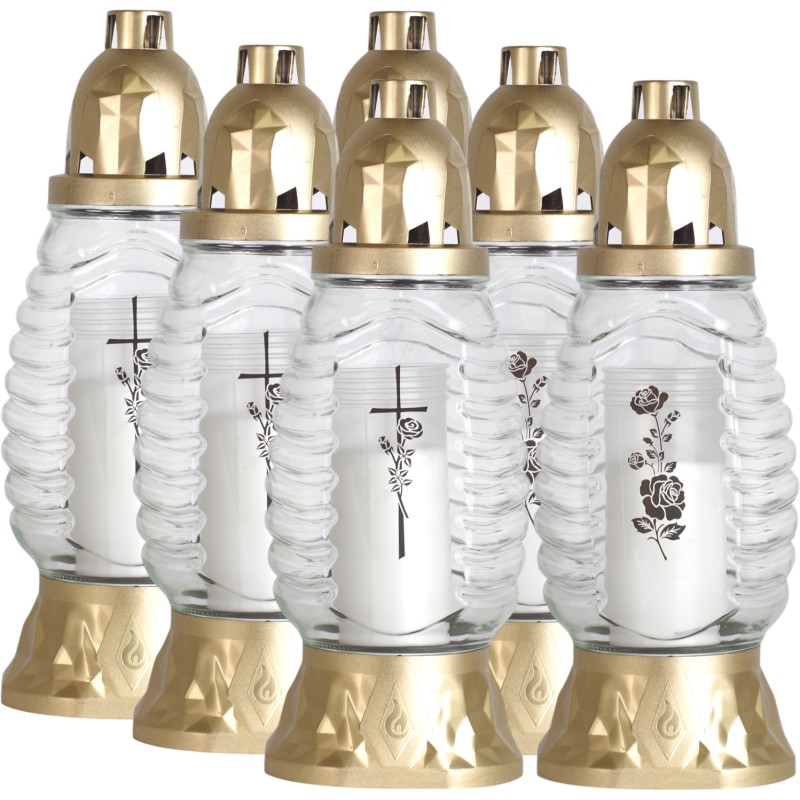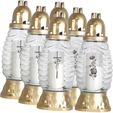 Znicze szklane w kolorze transparentnym. Zawierają wprasowane wkłady parafinowe o czasie palenia do 28 godzin. Znicze najwyższej jakości. Wkłady nie kopcą i wypalają się równomiernie do końca.