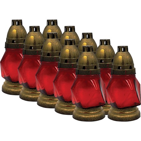 Znicze szklane w kolorze czerwonym. Zawierają wprasowane wkłady parafinowe o czasie palenia do 14 godzin. Znicze najwyższej jakości. Wkłady nie kopcą i wypalają się równomiernie do końca.