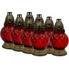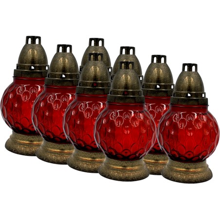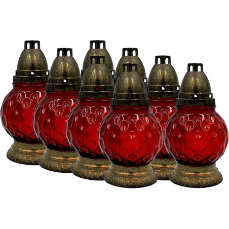 Znicze szklane w kolorze czerwonym. Zawierają wprasowane wkłady parafinowe o czasie palenia do 18 godzin. Znicze najwyższej jakości. Wkłady nie kopcą i wypalają się równomiernie do końca.