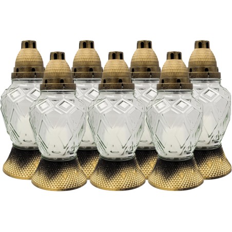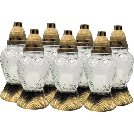 Znicze szklane w kolorze transparentnym. Zawierają wprasowane wkłady parafinowe o czasie palenia do 22 godzin. Znicze najwyższej jakości. Wkłady nie kopcą i wypalają się równomiernie do końca.