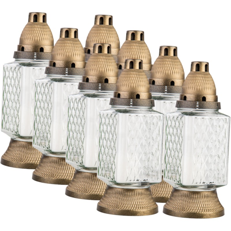 Znicze szklane w kolorze transparentnym. Zawierają wprasowane wkłady parafinowe o czasie palenia do 22 godzin. Znicze najwyższej jakości. Wkłady nie kopcą i wypalają się równomiernie do końca.