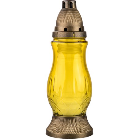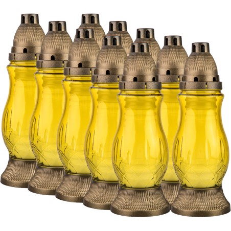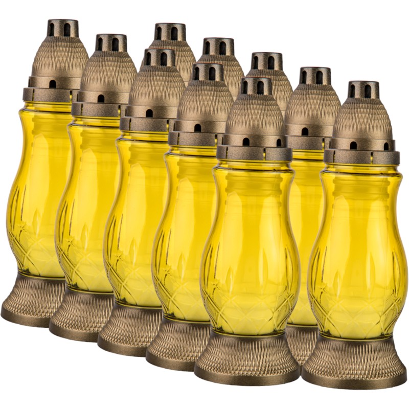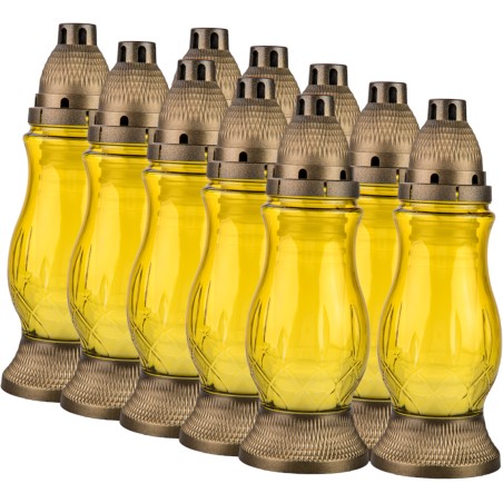 Znicze szklane w kolorze żółtym. Zawierają wprasowane wkłady parafinowe o czasie palenia do 30 godzin. Znicze najwyższej jakości. Wkłady nie kopcą i wypalają się równomiernie do końca.