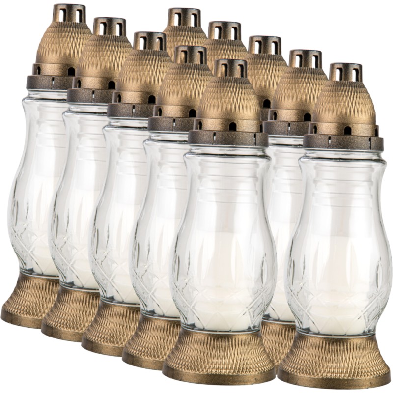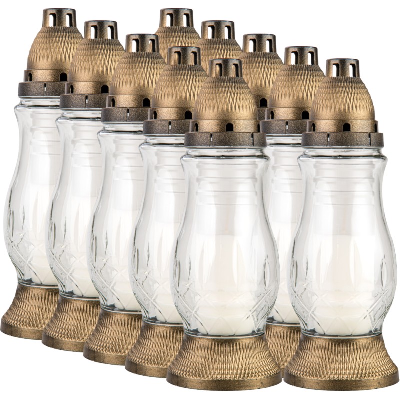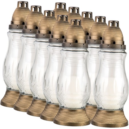 Znicze szklane w kolorze transparentnym. Zawierają wprasowane wkłady parafinowe o czasie palenia do 30 godzin. Znicze najwyższej jakości. Wkłady nie kopcą i wypalają się równomiernie do końca.