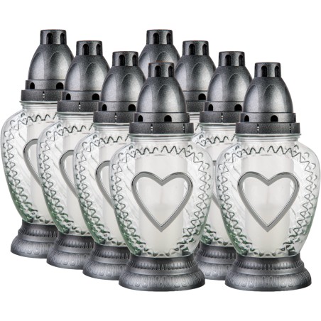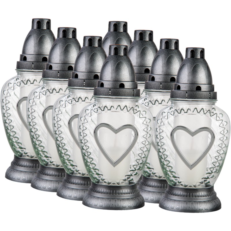 Znicze szklane w kolorze transparentnym. Zawierają wprasowane wkłady parafinowe o czasie palenia do 22 godzin. Znicze najwyższej jakości. Wkłady nie kopcą i wypalają się równomiernie do końca.