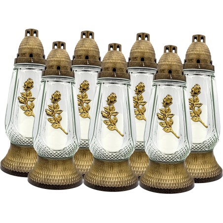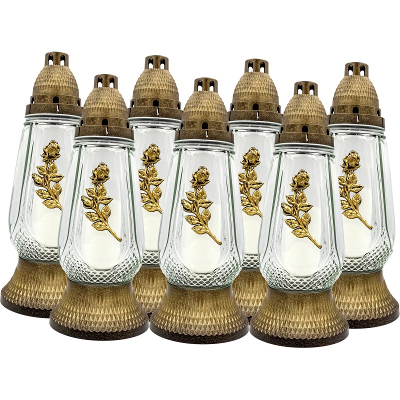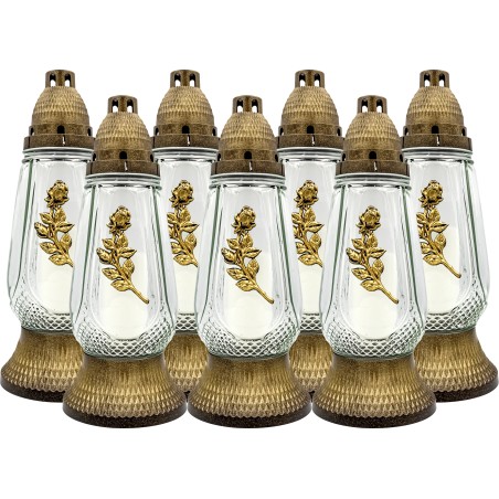 Znicze szklane w kolorze transparentnym. Zawierają wprasowane wkłady parafinowe o czasie palenia do 40 godzin. Znicze najwyższej jakości. Wkłady nie kopcą i wypalają się równomiernie do końca.