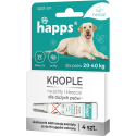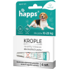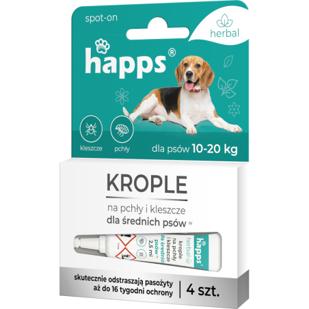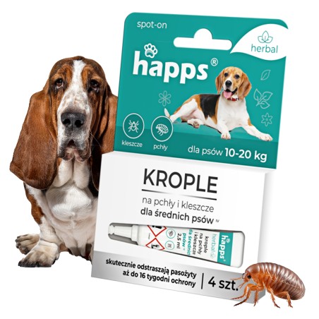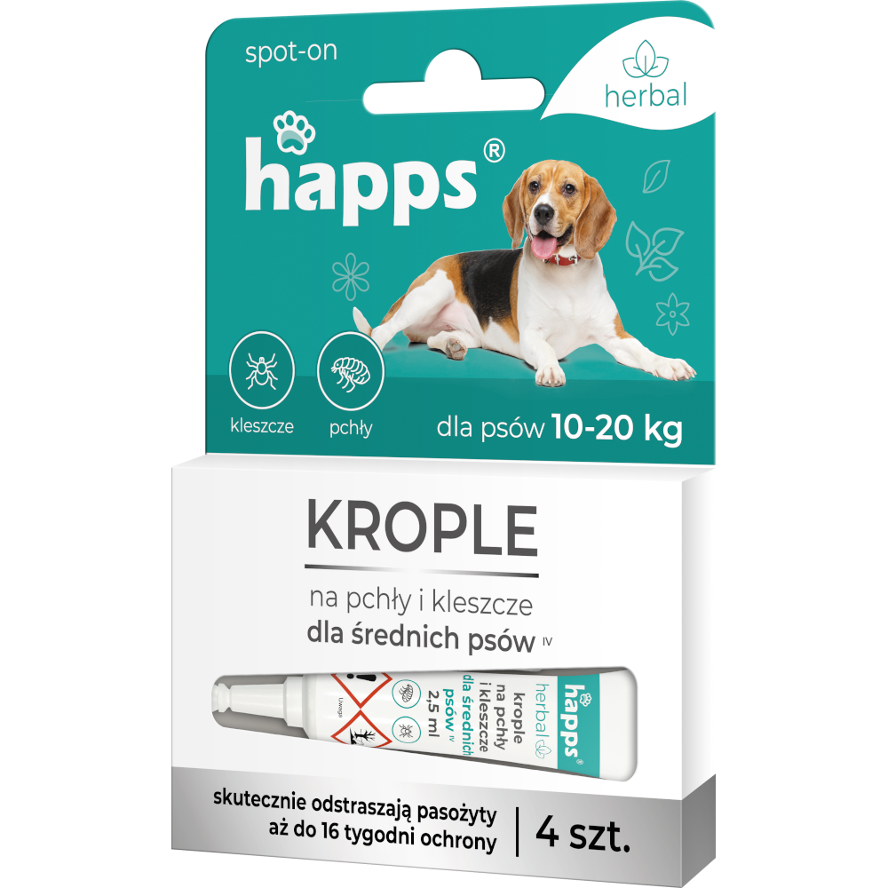 Krople HAPPS HERBAL to preparat do odstraszania pcheł i kleszczy, który aplikuje się bezpośrednio na skórę psa. Może być stosowany zarówno u dorosłych zwierząt, jak i u szczeniąt powyżej 12 tygodnia życia. 4 aplikacje zapewniają ochronę do 16 tygodni.